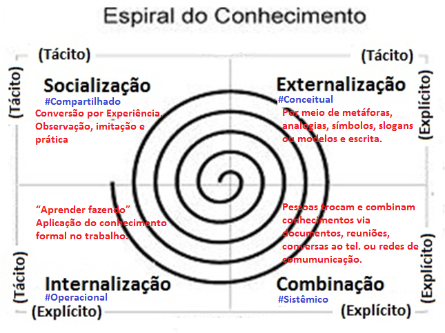 Ainda segundo Nonaka e Takeuchi, a gênese do conhecimento está identificada na interação das duas formas de conhecimento, tácito e explícito, explicados anteriormente, onde são considerados quatro formas de conversão: 1 – sociabilização (tácito-tácito), é o processo de compartilhamento de conhecimento tácito por meio da experiência, ou seja, um aprendiz pode adquirir conhecimento tácito diretamente de outros, sem usar a linguagem, mas pela observação, imitação e prática; 2 – externalização (tácito-explícito), é o processo de articulação do conhecimento tácito em conceitos explícitos, por meio de metáforas, analogias, símbolos, slogans ou modelos, a escrita é uma forma de converter o conhecimento tácito em articulável; 3 – combinação (explícito-explícito), é o processo de sistematização de conjuntos diferentes de conhecimento explícito, as pessoas trocam e combinam conhecimentos por meios como documentos, reuniões, conversas ao telefone ou redes de comunicação computadorizadas, a educação e o conhecimento formal nas escolas assumem essa forma; 4 – internalização (explícito-tácito) – está intimamente ligado aos processos de “aprender fazendo”, de incorporação do conhecimento explícito no conhecimento tácito, por meio da aplicação do conhecimento formal nas atividades do trabalho;