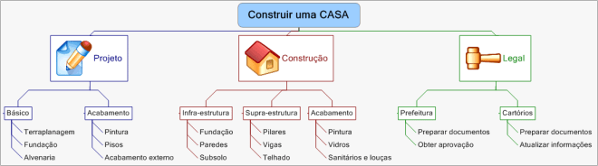 Se quiser exercitar isso, imagine, por exemplo, o que é necessário para “construir uma casa”, pense sobre o projeto, a construção, aspectos legais; em seguida, com uma caneta, desenhe no papel o núcleo (Fazer uma Casa) e cada elemento, e depois associado a cada um destes elementos outros sub-elementos detalhes, como em uma árvore com tronco, galhos e folhas.