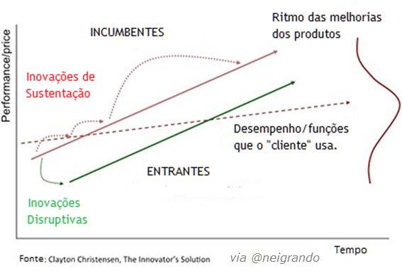 As inovações disruptivas são inicialmente consideradas inferiores pela maioria dos clientes de corporações estabelecidas. As empresas que fornecem tais novidades melhoram o desempenho delas ao longo do tempo e sobem de nível no mercado.