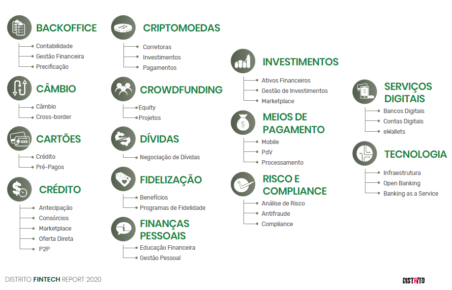 Abaixo temos diversas categorias e subcategorias de Fintechs com a taxonomia organizada pela Distrito em seus excelentes relatórios sobre o tema.