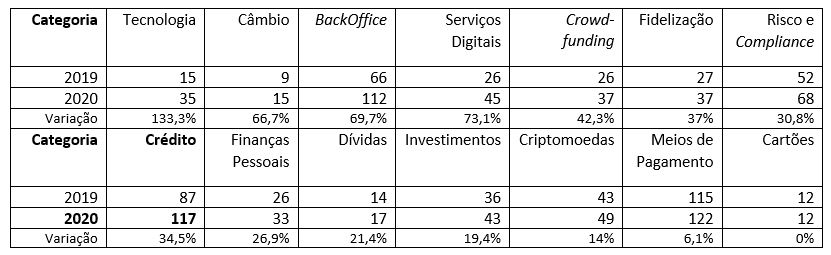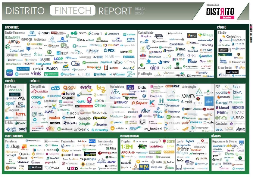 Conforme relatório da Distrito de 2019 o Brasil já apontava este setor como a ponta de lança do ecossistema de startups no Brasil, onde foram mapeadas 553 Fintechs. Na versão 2020, 742 startups foram mapeadas, ous seja, tivemos um aumento de 34% de Fintechs.