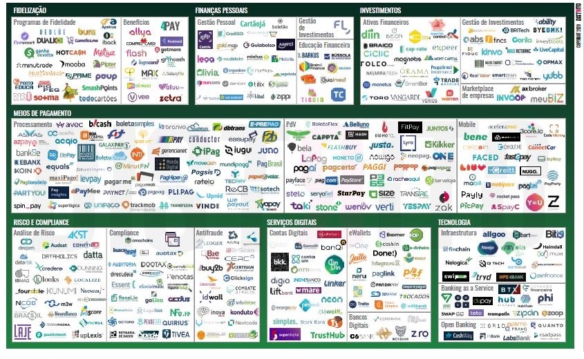 Aqui tomei emprestado de um relatório recente da Distrito de 2020 esta enorme lista de Fintechs brasileiras divididas em categorias, apenas para se ter uma ideia da força que tais empresas tem hoje em nosso mercado.