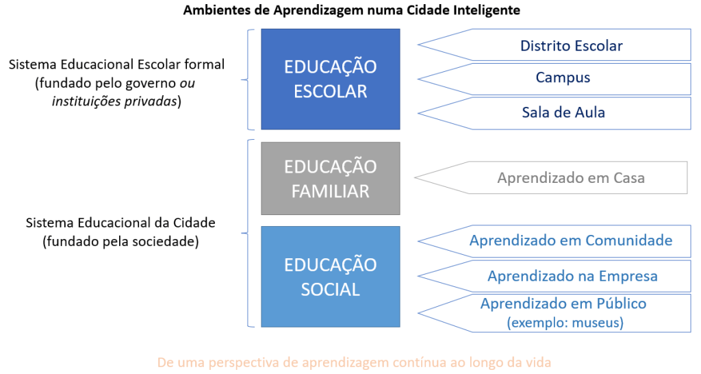 Para uma cidade se tornar mais inteligente, é necessário ter uma visão de toda a cidade e inspecionar os papéis de apoio dos vários tipos de ambientes de aprendizagem na aprendizagem dos cidadãos.