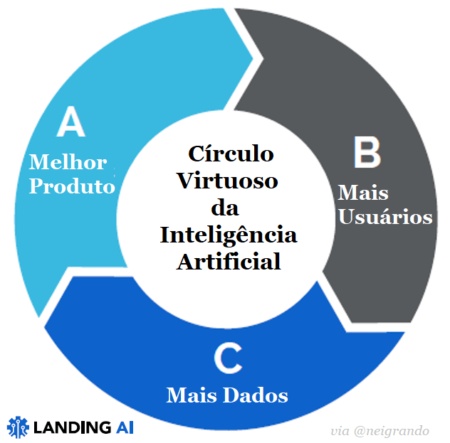 Desenhe estratégias alinhadas com o ciclo de feedback positivo do “círculo virtuoso da IA”: em muitos setores, veremos o acúmulo de dados levando a um negócio defensável: