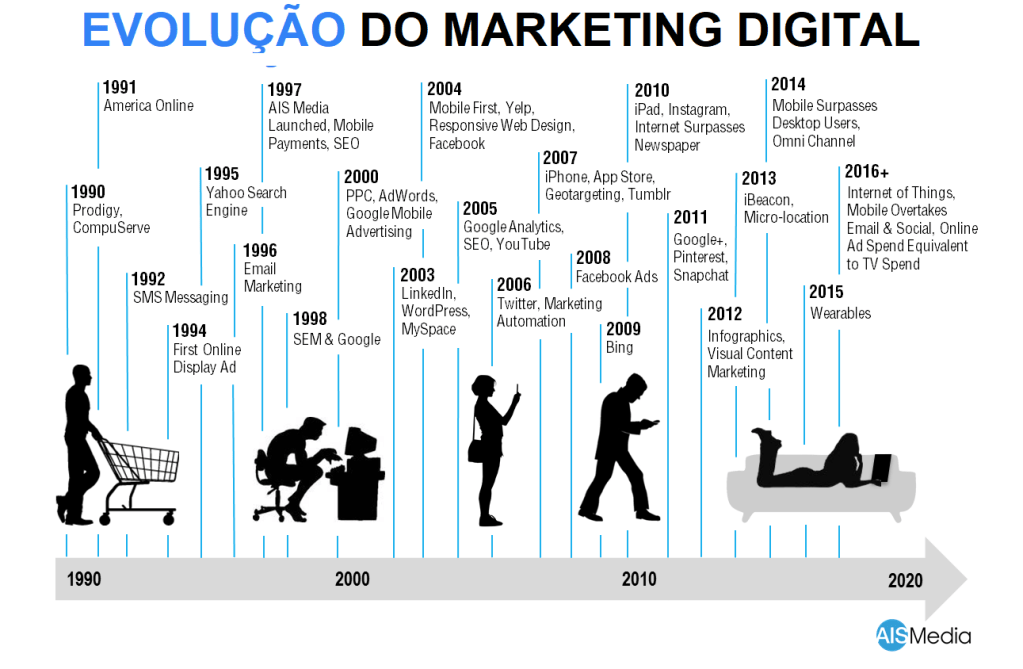 Esta linha do tempo que segue, mostra claramente a evolução do marketing digital e tecnologias relacionadas, ele acompanhou a mudança do comportamento do consumidor e sua relação com as mídias e as marcas. A realidade é que a concorrência aumentou, o consumidor ficou mais exigente e o marketing precisou evoluir para atendê-lo melhor em sua jornada e experiência de consumo.