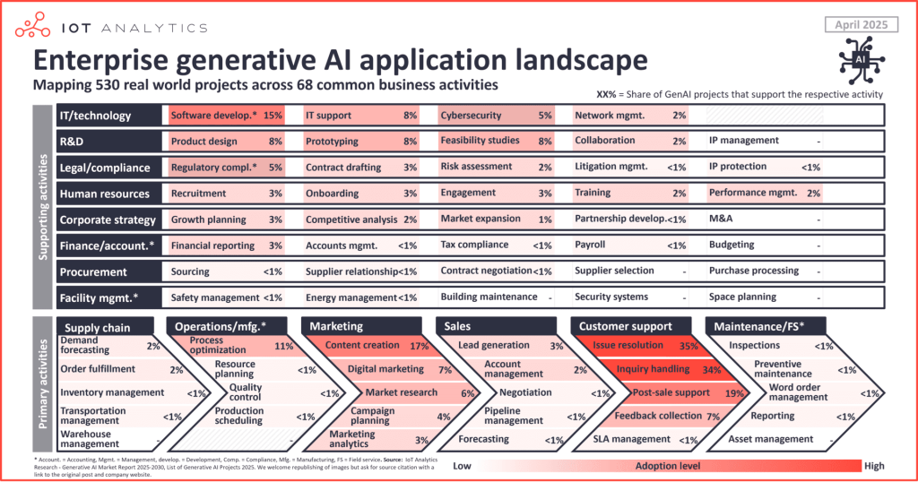A principal atividade comercial impulsionada pela IA generativa é a resolução de problemas do cliente, aparecendo em 35% dos 530 projetos empresariais que a IoT Analytics identificou e publicou em sua Lista de Projetos de IA Generativa (publicada em fevereiro de 2025).