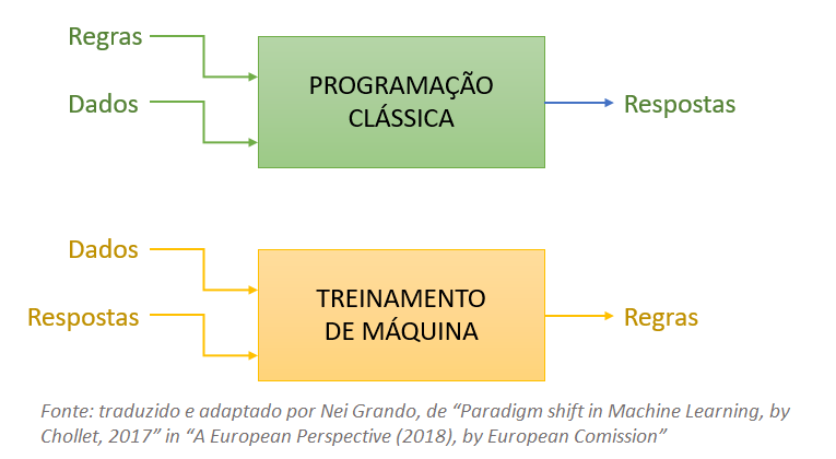 Esse diagrama simplificado apresenta a diferença básica entre a Programação Clássica de computadores versus a Aprendizagem de Máquina, como segue: