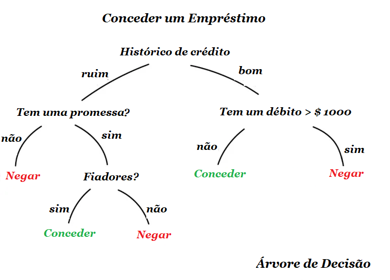 Um exemplo de pergunta estranha seria se o credor possui uma renda mensal maior que R$ 1280,50. No entanto, a máquina faz essas perguntas para dividir melhor os dados em cada etapa.