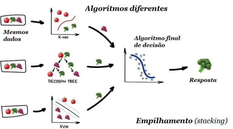 Ressalto aqui a palavra “diferente”. Misturar os mesmos algoritmos nos mesmos dados não faria sentido. A escolha dos algoritmos é totalmente de quem está resolvendo o problema. No entanto, para o modelo final de tomada de decisão, a regressão geralmente é uma boa escolha.