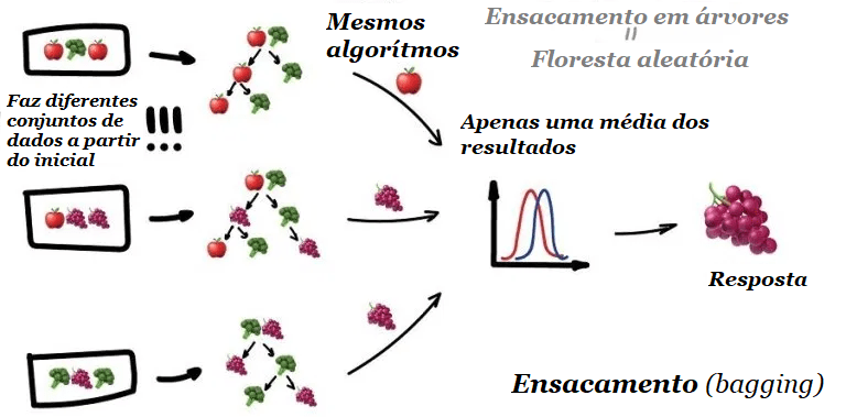 Também conhecido como Bootstrap AGGregatING. É um método que usa os mesmos algoritmos, mas treina-os com diferentes subconjuntos de dados originais e no final usa apenas os resultados médios.