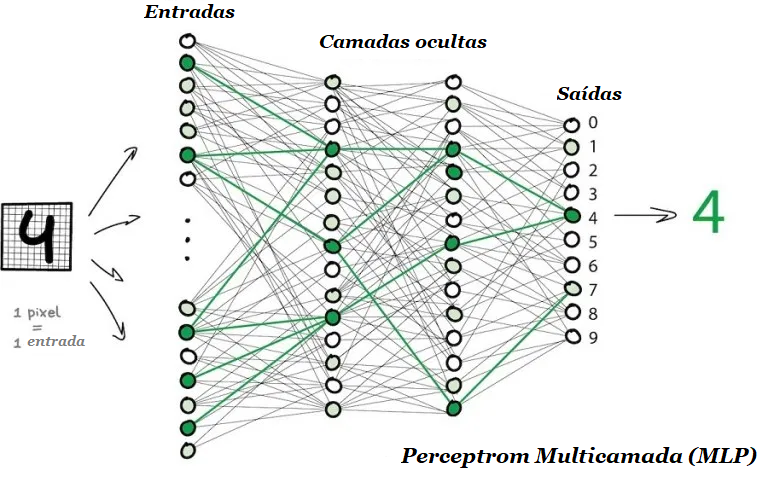 Se você lançar um número suficiente de camadas e colocar os pesos corretamente, obterá o seguinte: aplicando à entrada, digamos, a imagem do dígito manuscrito 4, pixels pretos ativam os neurônios associados, eles ativam as próximas camadas e assim por diante, até que finalmente acenda a saída encarregada dos quatro. O resultado é alcançado.