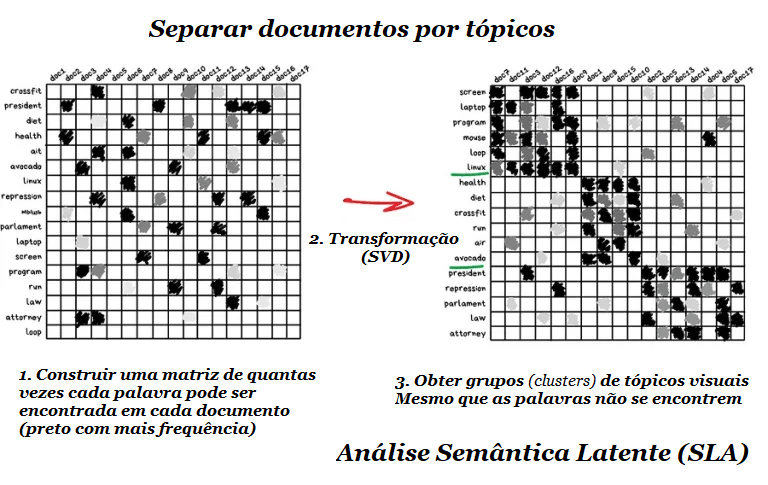 Algoritmos populares: Principal Component Analysis (PCA), Singular Value Decomposition(SVD), Latent Dirichlet allocation (LDA), Latent Semantic Analysis (LSA, pLSA, GLSA), t-SNE (para visualização).