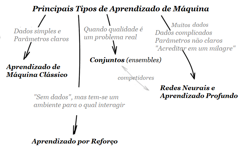 Vale lembrar que o aprendizado de máquina depende essencialmente de três elementos: 1) Dados – com quantidade maior possível e qualidade o melhor de dados possível, relacionados ao problema que se deseja resolver; 2) Algoritmos – com o algoritmo ou conjunto deles, apropriado(s) para resolver o problema desejado; e 3) Parâmetros – usados no ajuste do tratamento dos dados.